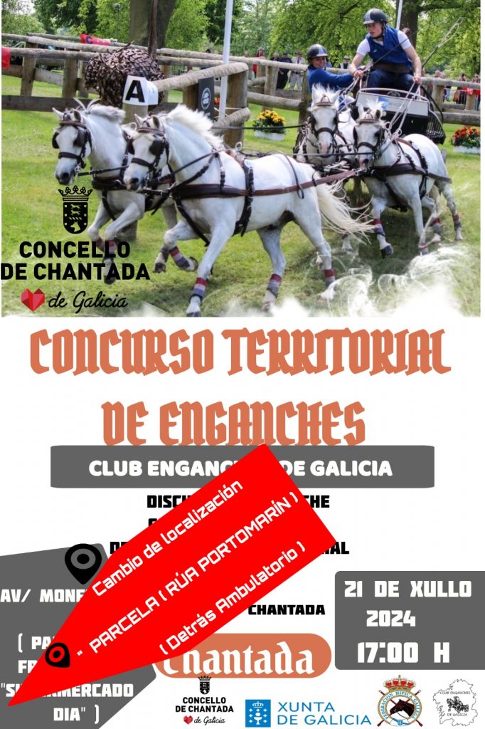 Chantada acoge el 21 de este mes de julio el Concurso de Enganches Ayuntamiento de Chantada con la colaboración del Club de Enganches de Galicia. La recepción de los caballos será a las 15:00h., media hora después se hará la revisión veterinaria y después del reconocimiento de pista la competición comenzará a las 17:00h. para prolongarse hasta después de las 19:00h. La de Chantada es una de las 6 pruebas puntuables para el Campeonato Gallego.