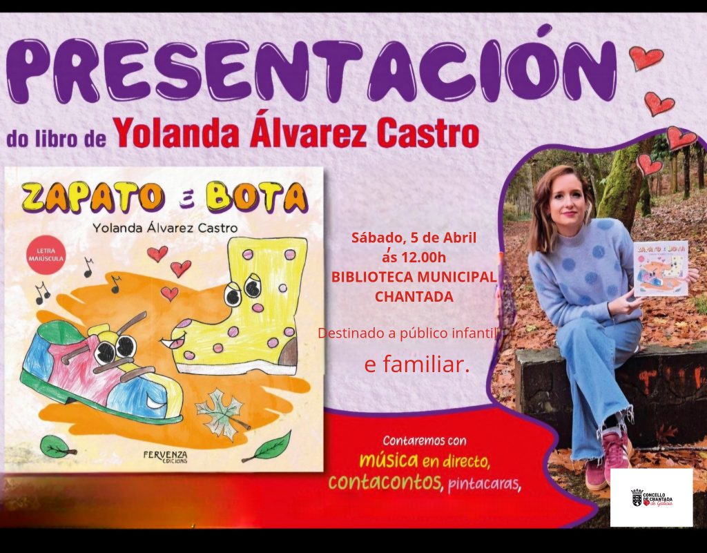 La Biblioteca Municipal de Chantada acoge este sábado, 5 de abril, la presentación del libro “Zapato e Bota” de Yolanda Álvarez Castro. Con esta actividad el Ayuntamiento de Chantada conmemora el Día del Libro Infantil y Juvenil, que a pesar de ser el día 2, se celebra este sábado para poder contar con la música en directo que acompaña a esta presentación.