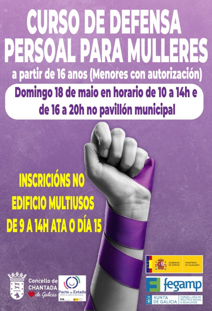 A este respecto organízase para o domingo, 18 de maio, un Curso de Defensa Persoal Feminina, que se desenvolverá no Pavillón Municipal en horario 10:00h a 14:00h e de 16:00h a 20:00h.