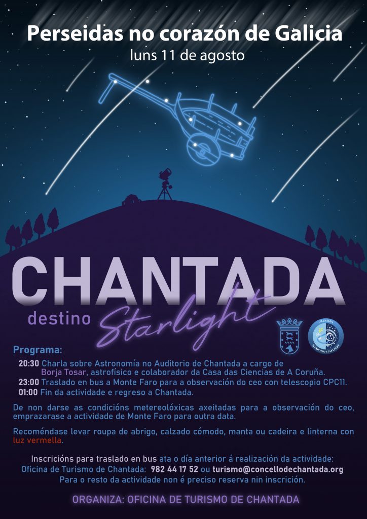 Na actividade que guiará en Chantada, as Perseidas ou Lágrimas de San Lourenzo, chuvia de meteoros que se fai especialmente visible durante as noites de xullo e agosto, serán as protagonistas. A xornada comezará cunha charla no Auditorio Municipal ás 20:30h. Posteriormente, ás 23:00h, as persoas participantes trasladaranse en autobús ao Monte Faro, para ás 23.30h iniciar a Observación do ceo cun telescopio CPC11. O fin da actividade e regreso a Chantada está previsto para as 01:00h. Borja Tosar asegura que “ninguén que veña a unha observación deste tipo queda indiferente, se o ceo non está nubrado veremos moitas cousas que acontecen mirando para arriba”.