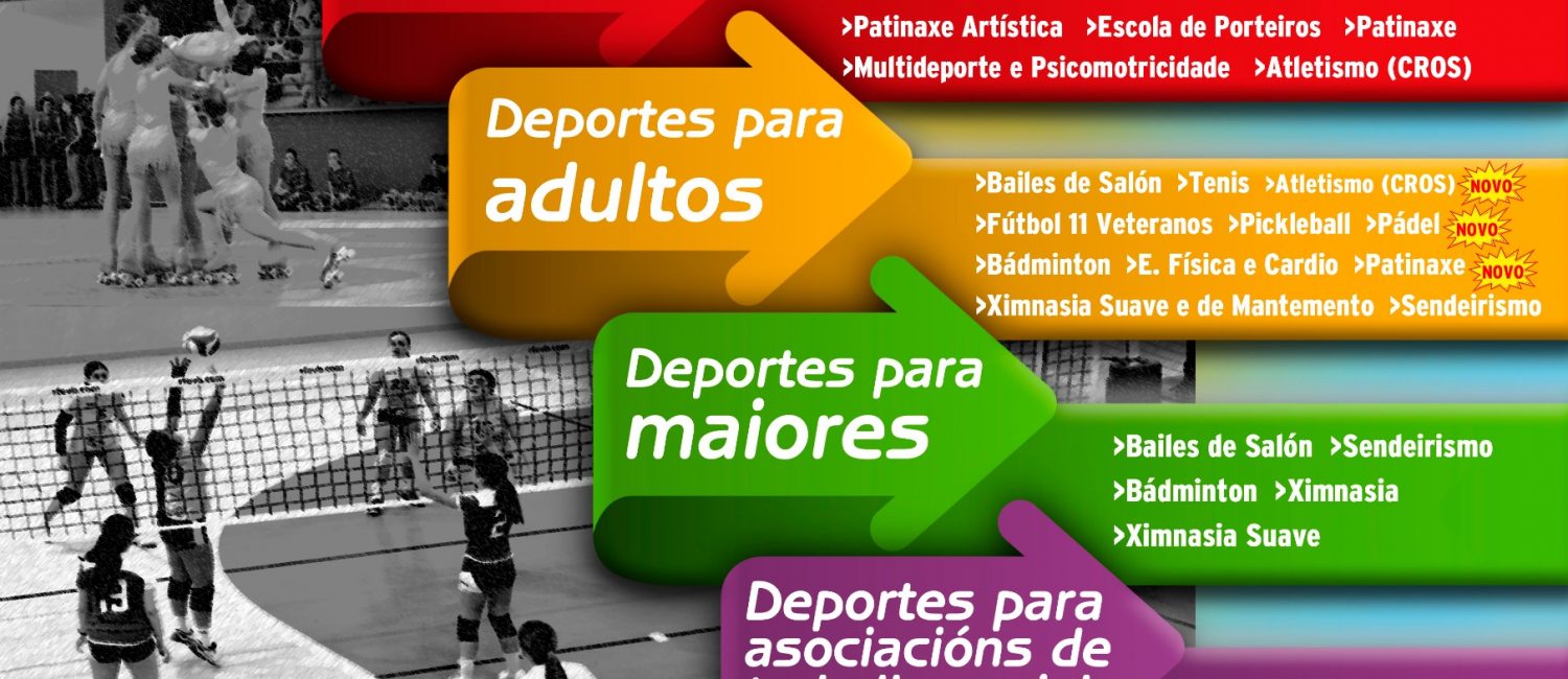 - Adultos: bailes de salón, tenis, atletismo (cros), fútbol 11 veteranos, pickleball, padel, bádminton, educación física e cardio, patinaxe, ximnasia de mantemento e sendeirismo.
