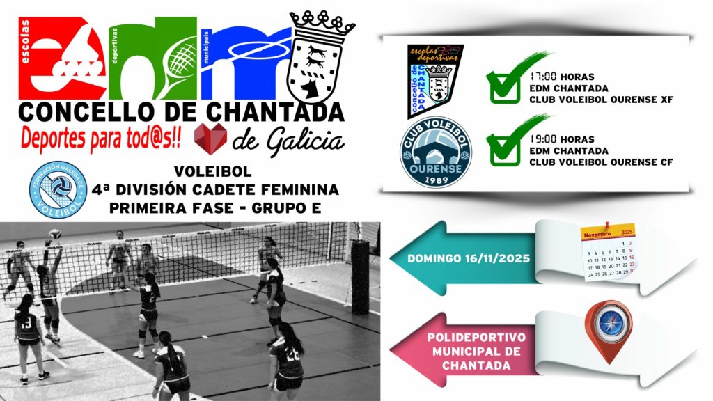 El estreno se hará este domingo, 16 de noviembre, con dos encuentros de la primera fase del grupo E de la cuarta división cadete femenina que enfrentarán al EDM Chantada y al Club Voleibol Ourense XF, a las 17:00h y a las 19:00h. Las locales comienzan competición con el CVO, un club fundado en el año 1989 que cuenta con una fuerte estructura de cantera con más de 250 jóvenes.