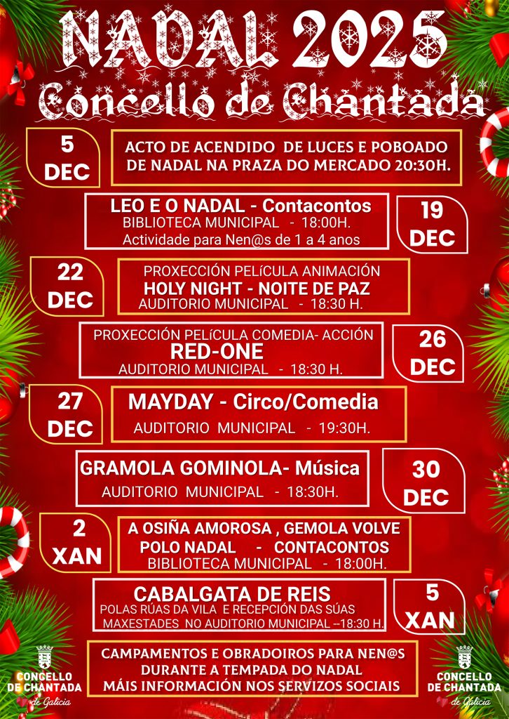 Antes de finalizar el 2025 la programación del Ayuntamiento de Chantada también incluye propuestas deportivas y el 27 de diciembre desde las 17:15h se correrá la II San Silvestre no corazón de Galicia en la que no faltarán docenas de corredores/as con disfraz de Navidad para seguir creando el ambiente de estas fiestas.