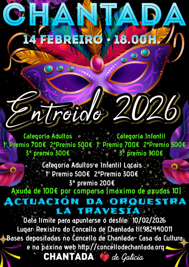 O Concello de Chantada, co obxectivo de promocionar e conservar as tradicións vinculadas co Entroido, organiza o Desfile de Comparsas que se celebrará o sábado, 14 de febreiro; ademais de colaborar tamén co Entroido Ribeirao, de especial interese polo seu carácter etnográfico e que comeza as celebracións o día 1 de febreiro. O Desfile de Comparsas ao que o concello destina 6.000€, 5.000€ en premios e 1.000 € en axudas, comezará ás 18:00h na Avda de Lugo, á altura da DomusVi para rematar na Praza de Galicia onde a actuación da orquestra La Travesía porá o punto e final á celebración.