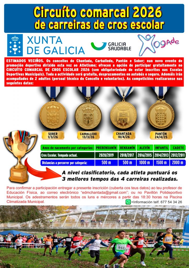 O III Circuíto Comarcal de Carreiras de Cros Escolar do programa de deporte infantil da Xunta de Galicia, XOGADE, comeza este domingo, 1 de marzo, no Concello de Sober, podendo inscribirse ata o xoves 26 para participar nesta primeira proba. Nesta edición participan 4 concellos, sendo a cita no Concello de Chantada o 18 de abril. Seguirase o seguinte calendario: