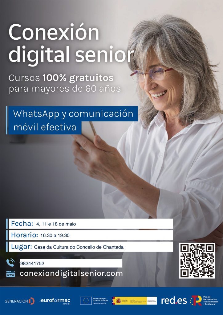 O programa de formación gratuíta Conexión Dixital Senior + chega ao Concello de Chantada con dúas formacións dirixidas a maiores de 60 anos; Whatsapp e comunicación móvil efectiva e Xestión dixital de trámites coa administración pública.