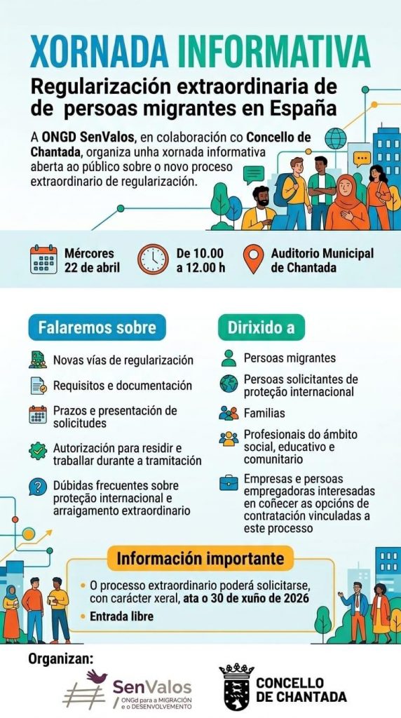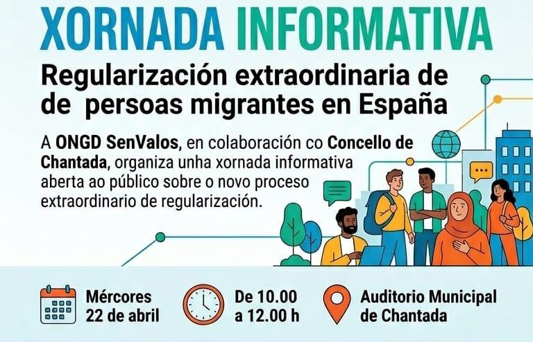 O Concello de Chantada a través da concellaría de Servizos Sociais e a ONGD SenValos organizan para o mércores 22 de abril, en horario de 10.00 a 12.00 horas, unha xornada informativa sobre a regularización extraordinaria de persoas migrantes en España.